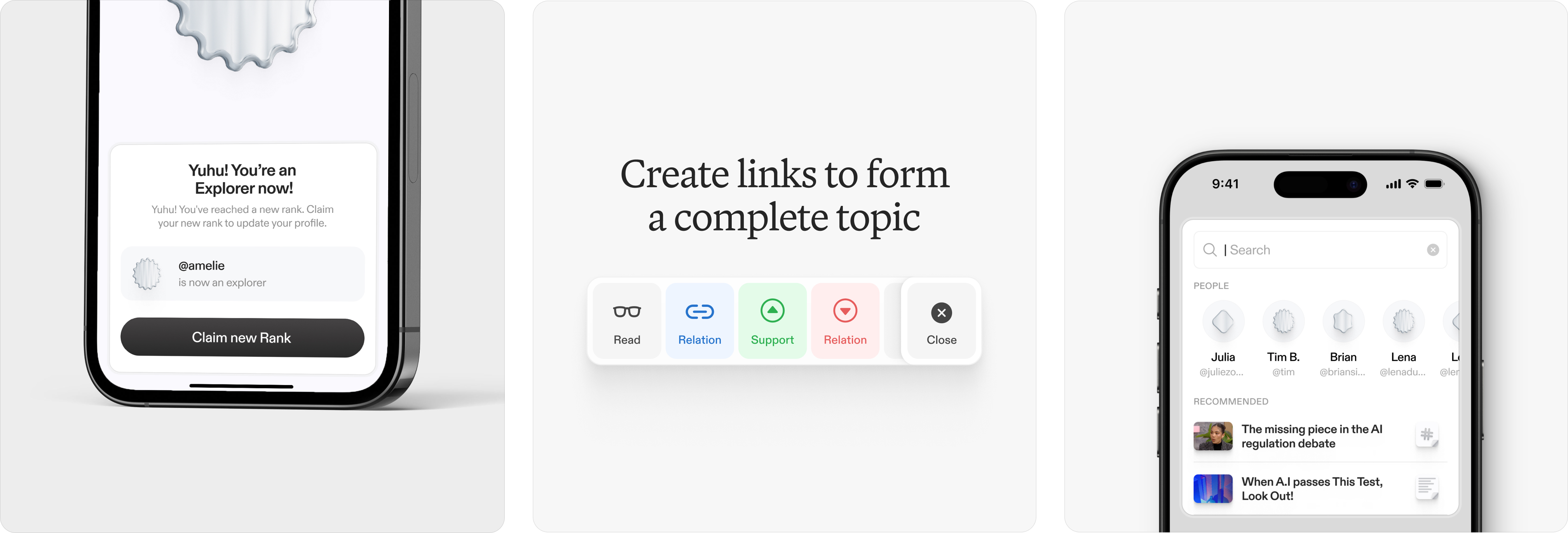 By implementing supportive, contradictory and relational links, links to other content are made transparent. We also enable our users to discuss topics with the help of comments. We utilize swam intelligence by leveraging different knowledge from our users to improve the context on the platform. Through reward systems such as “Ranks” or “Achievements”, we encourage our users to actively engage with their own and other people's content in order to organize the flood of content and make it easier to understand.